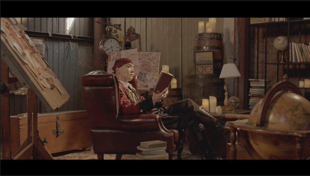 These villain concepts made for the perfect reveal on Halloween. Each member has a different costume that matches the type of villain they’re portraying for the photoshoot. First we have Namjoon as a mad scientist. This pretty obviously matches Namjoon’s personality. The only “plain” part of this outfit are his clear goggles. His white lab coat is covered in multicolored words and patterns with ‘Persona’ seen written on both his sleeves. His red tie is similarly messy, in a very charming way, with letters of varying sizes and teddy bears taking up the pattern. This whole look, including the chalkboard in the back, is very clearly a call back to “PERSONA”. Jin’s next with the shadow hacker character. This character came out of nowhere for some, but Jin’s obsession with video games made this a bit more obvious to me. Either way, it’s a really cool look on Jin. We don’t get to see too much of his outfit from anything released so far, thought the baggy black ensemble really serves the careless look they’re going for. But really, I’m in love with just the messy hair and glasses look alone. Next is Yoongi as the gray pianist. A lot of people weren’t really sure what this character idea even means. I think they were trying to go for the tortured/obsessed artist feel, but it definitely isn’t an obvious pick for a villain. Pairing Yoongi with a piano wins, regardless. You can never go wrong with a good puffed sleeve look underneath a black vest. I also liked the green paint splatter details on the sleeves. Closing off the Hyung line is Hobi as a “mystic strategist”. He’s a pirate. This one was a pleasant surprise. The look walks the line between modern and old fashioned. He has a typical bandana around his head that is sometimes covered with a black pirate hat. He also has an extremely gorgeous red and black coat with striking gold buttons. But along with this we see a more modern black, floral pattern on his button-up shirt. The black tie he wears and gold chains attached to his jacket also feel more modern. And topping it all off is the most adorable scar I’ve ever seen.