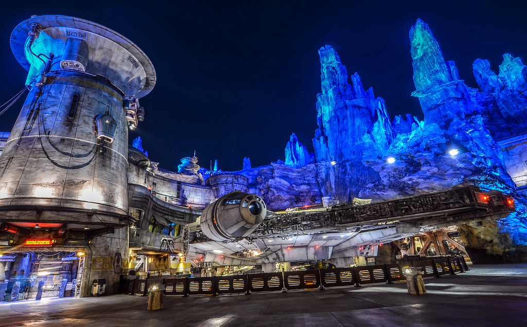 Galaxy’s Edge has a much larger area, and once again, relies on details to immerse you. Aurebesh, or the Star Wars alphabet, is either used or imitated on every sign. Cast members will greet you with “bright suns” or “rising moons” and they all have some kind of story explaining how they came to Batuu. Familiar ships are docked all over the land, including the beloved Millenium Falcon. Instead of soundtrack music, DJ Rex, the droid who can be seen in Oga’s Cantina, plays cantina music over every speaker. There are even parts of the land that are designated for the First Order or the Resistance, clueing you into their warring presence on the planet. The main issue with Batuu is perhaps that it focuses too much on immersion. Shops, in order to seem like humble establishments run by locals, are far too small for Disneyland crowds. There’s also the fact that the land looks a bit bland at parts in order to create the cohesive look of a rundown haven for those on the run. But that goes back to my criticism of Disney deciding to create their own planet rather than recreating a place fans have wanted to visit for a long time.